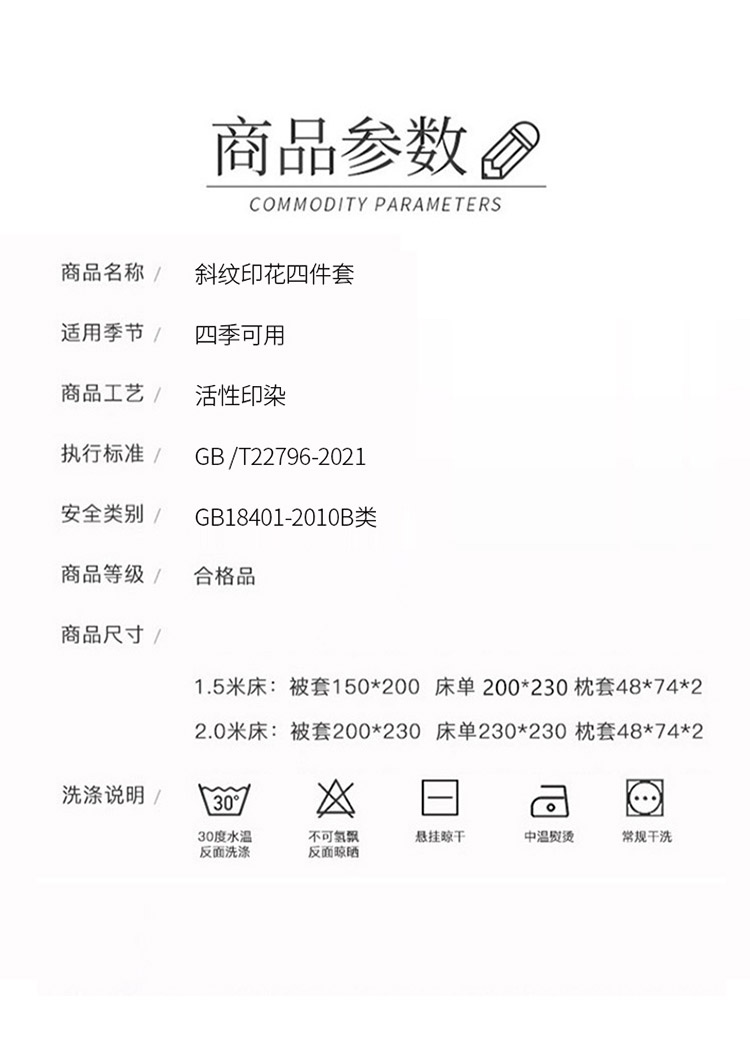 1.5米床:被套150cm*200cm 床单200cm*230cm 枕套48cm*74cm*2