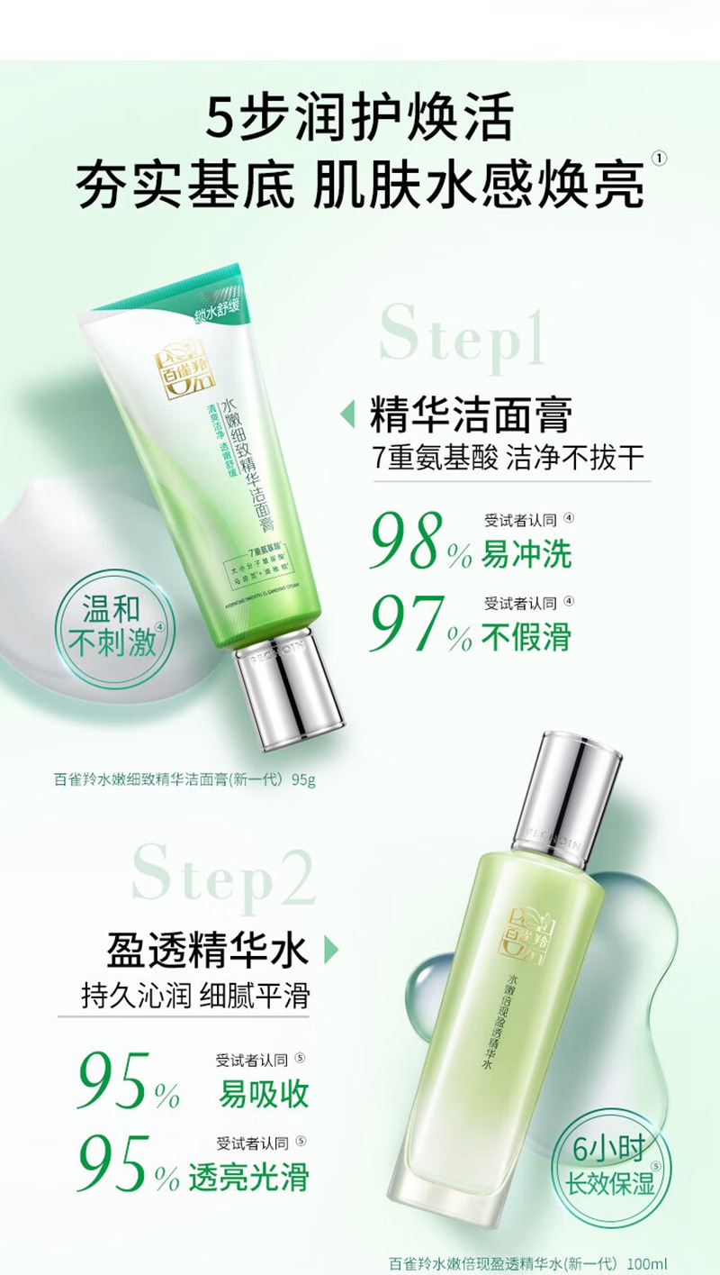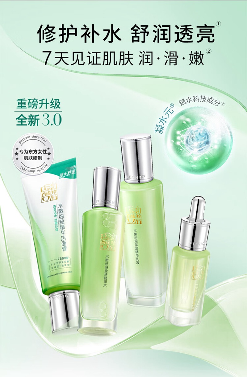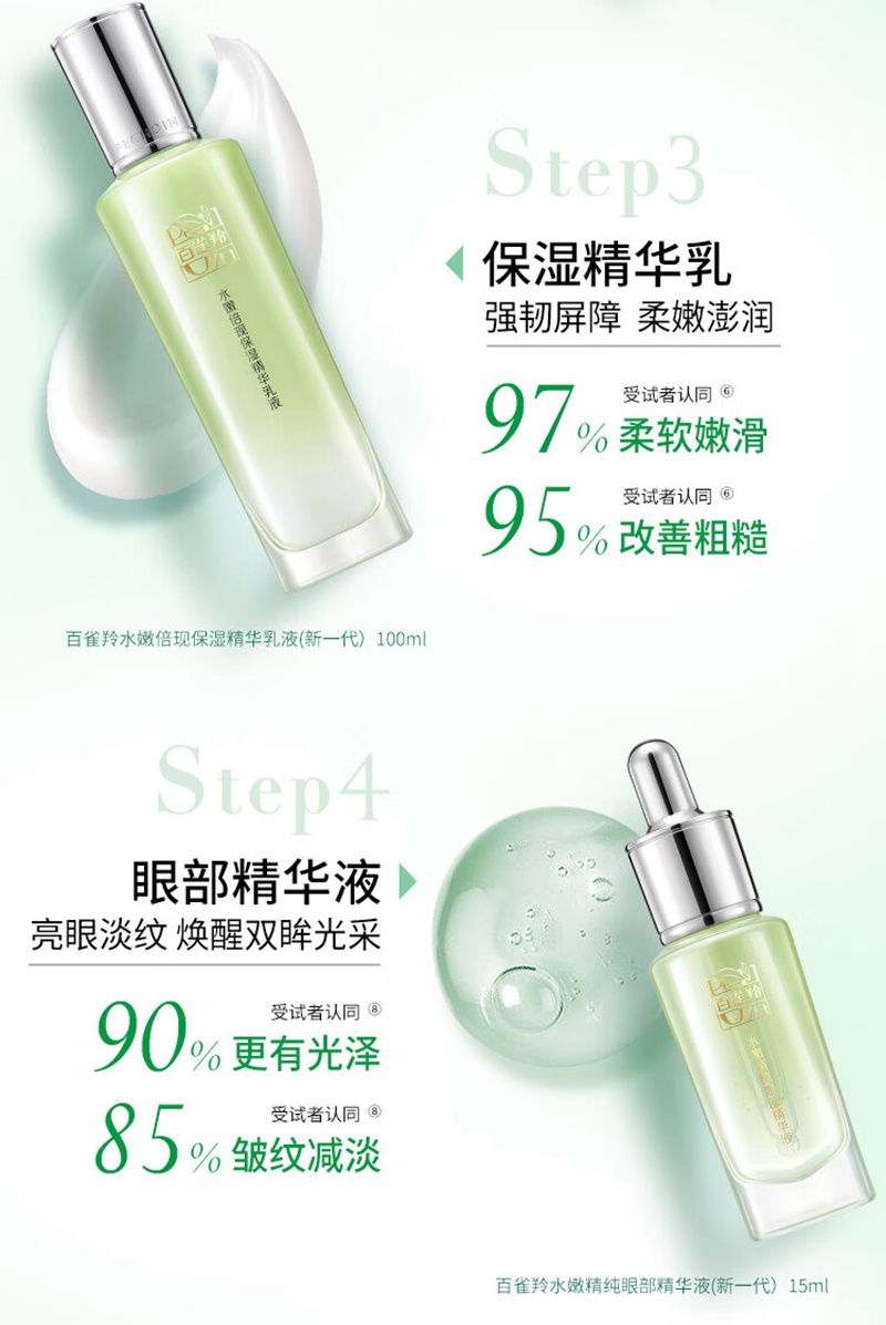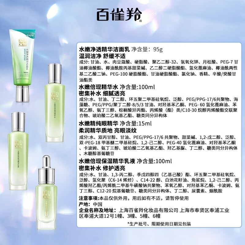 内含:精华洁面膏95g、 盈透精华水100ml、 保湿精华乳液100ml、 眼部精华液15ml