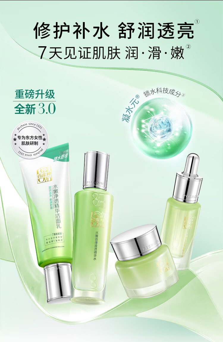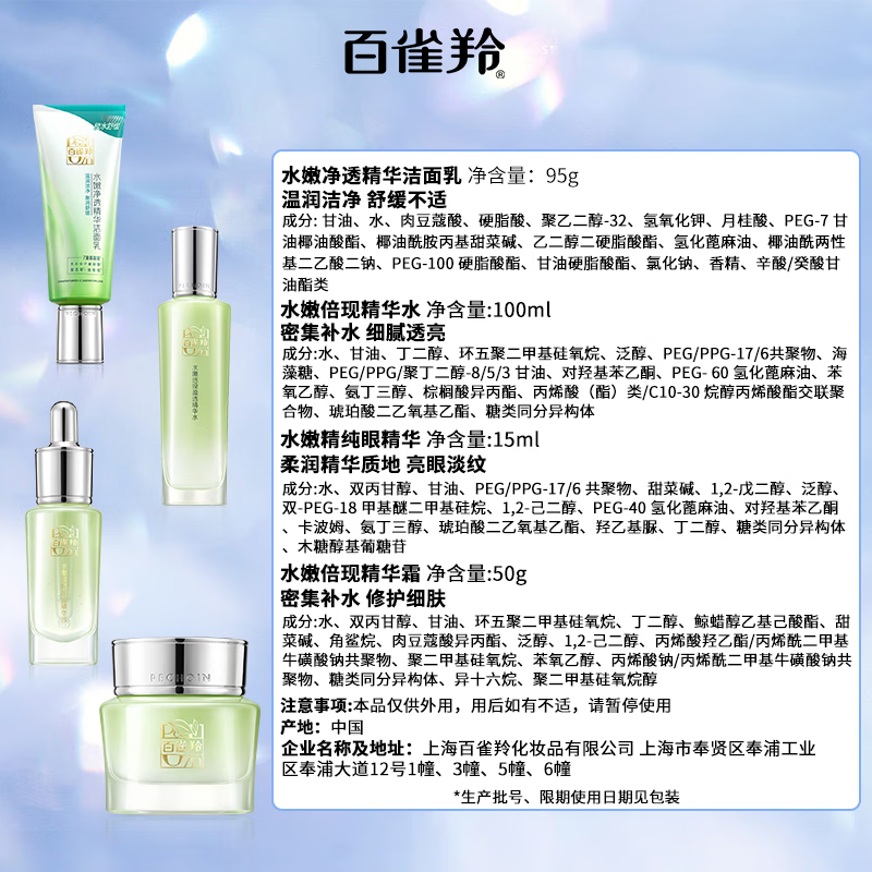 内含:精华洁面膏95g、 盈透精华水100ml、 保湿精华乳液100ml、 眼部精华液15ml