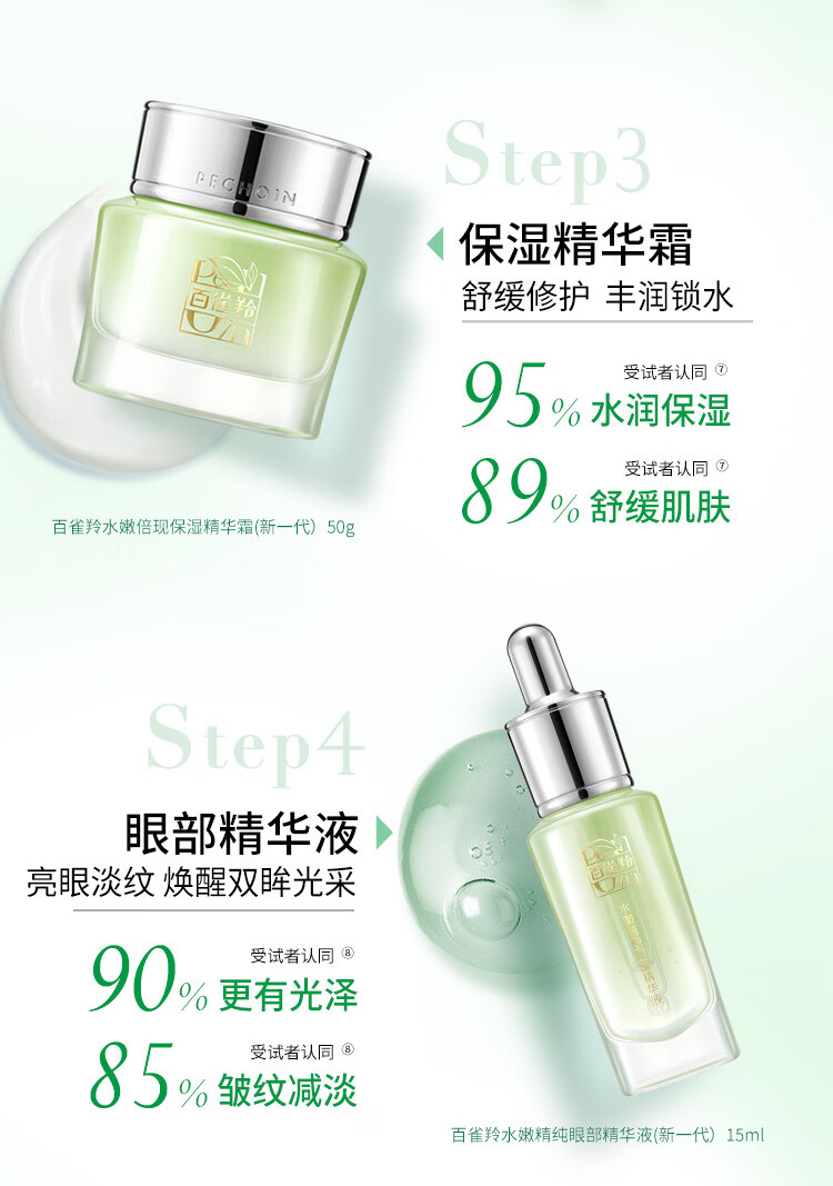 内含:精华洁面膏95g、 盈透精华水100ml、 保湿精华霜50g、 眼部精华液15ml